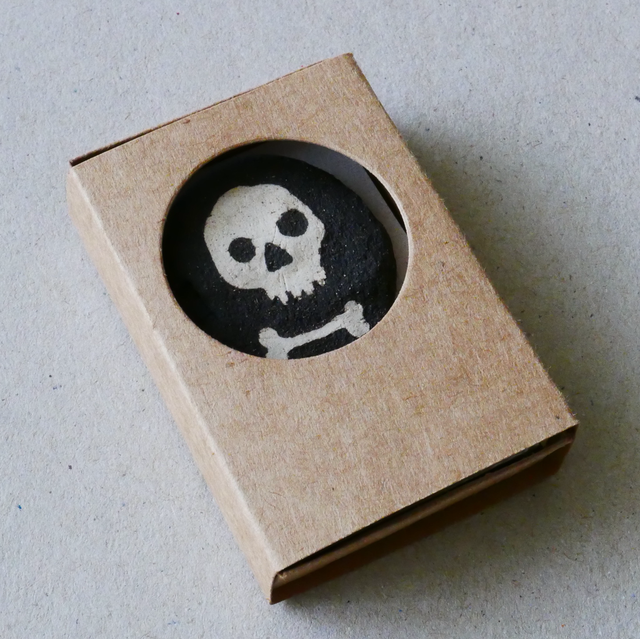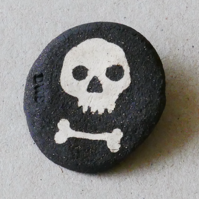 Inlaid Stoneware Memento Mori Pin Brooch. Each piece is made by hand and so is unique, so yours won’t be the one in the pics, but will be the same design with its own quirks and humanities baked in. Comes ready to pin on your favourite smoking jacket, or to stand, gawping out of its little matchbox display window as a reminder to live. In case you’re forgetting. Or don’t have time. £3.50 p&p.